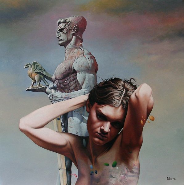 Curator: I am immediately drawn to the interplay between the hyperrealistic portraiture and the absurd combination of elements within this painting. It feels quite unsettling, almost melancholic. Editor: This is “Mali Genije – Little Genius” by Dragan Ilić Di Vogo, an acrylic on canvas created in 2012. It brings together aspects of surrealism, classical realism, and fantasy art. Curator: Classical realism is an interesting choice. It’s juxtaposed oddly with this fantastical assemblage of elements like the bird, the cherubic figure atop the peculiar fish, and what seems to be a constellation of colorful… pebbles? Editor: Indeed. Considering Di Vogo's Serbian background, the artwork resonates with cultural elements blending both classical artistic traditions and touches of national symbolism. This period in Serbia saw a surge in artists re-examining identity through personal symbolism and a reimagining of historical narratives. Curator: The gaze of the central figure dominates the composition. It possesses a striking level of detail, contrasting sharply with the background which appears deliberately less defined, more atmospheric. The almost photographic rendering highlights the subtle asymmetries of her face and, notably, that single tear. Editor: That is astute observation, and consider how this image was created shortly after Serbia underwent considerable sociopolitical change; it seems like the single tear represents a lament for cultural identities. Notice that it could perhaps stand for sorrow. The title itself "Little Genius", when placed within the broader societal shifts occurring in Serbia at the time, could hint at both a hopeful outlook and perhaps an ironic commentary. Curator: And the use of acrylic offers an intriguing textural element. The surface has a certain matte quality, which mitigates any potential glare, guiding the viewer's eye toward minute details, like the intricate patterns and subtle colour gradations found within the composition. Editor: Ultimately, whether a literal or figurative reading resonates most profoundly with each individual viewing the work. The tension is a captivating synthesis that elevates our experience. Curator: Yes, there's something profoundly engaging in seeing this all come together—it moves beyond just the surreal. Editor: A remarkable interplay of technique, materiality, and contextual depth—a testament to how individual art practices reflect on historical circumstances.