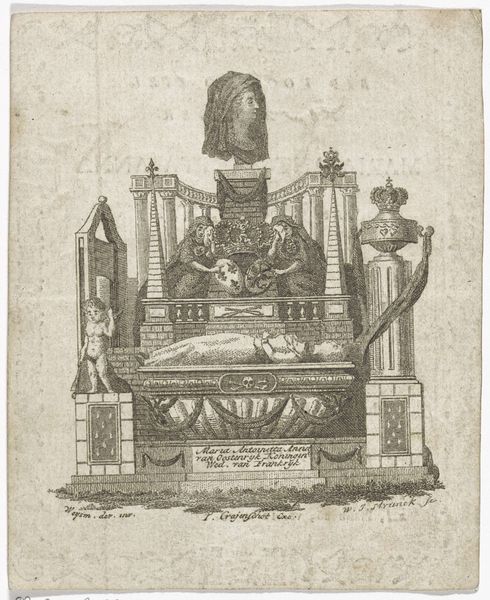 Curator: This engraving, created by Juste Nathan Boucher between 1755 and 1782, is entitled "Tombe met zuil in nis," or "Tomb with column in niche." It currently resides here at the Rijksmuseum. Editor: It has such a stark, melancholic quality. The grayscale line work is very precise. There's something so classically somber about it. The lines create textures but at the same time reinforce a sense of flatness, as if the grief it depicts is immovable. Curator: Indeed. The meticulous engraving work and neoclassical style serve to elevate what would otherwise be a very simple subject into an allegory on mortality and memory. Note the carefully rendered architecture that frames the tomb and reinforces the themes of permanence and remembrance. Editor: And those weeping figures, draped across the tomb, seem to emphasize human frailty against that architectural solidity. Do you see them as embodiments of grief, or perhaps more stylized symbols? Curator: It’s complex. Boucher plays with both, I think. He uses a formalist vocabulary of line and form but nods to history painting, aligning those symbolic forms to narratives of mourning. I suspect, through its inherent duplication as a print, this image also served a function, reaching and resonating with broader public sentiment. Editor: That's interesting—that neoclassical order is overlaid by emotional symbolism. Also, consider the gaze—there's nothing to see beyond this image of grief, it's almost self-referential, a complete system unto itself. The oval shape almost feels claustrophobic. Curator: Agreed, the closed-off composition pushes its viewer to really think about the concept and symbolism of mortality that was coming into focus throughout 18th century Europe. How this idea shaped individuals and society in turn. Editor: So while stark, and emotionally barren on first view, the art piece rewards a slow look by drawing upon layers of classical imagery and social and cultural relevance. Curator: Precisely. Boucher's technical skill is matched by a sophisticated awareness of his historical context. The composition creates both depth and commentary.