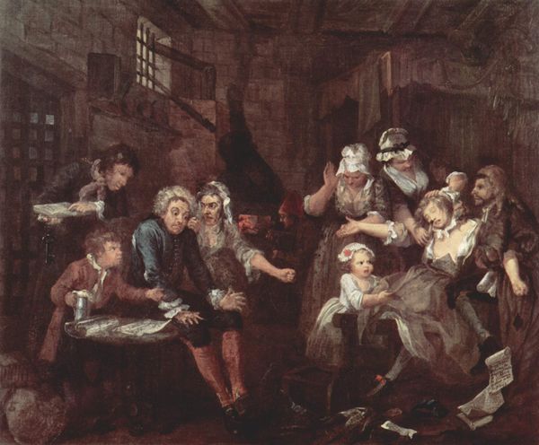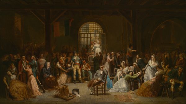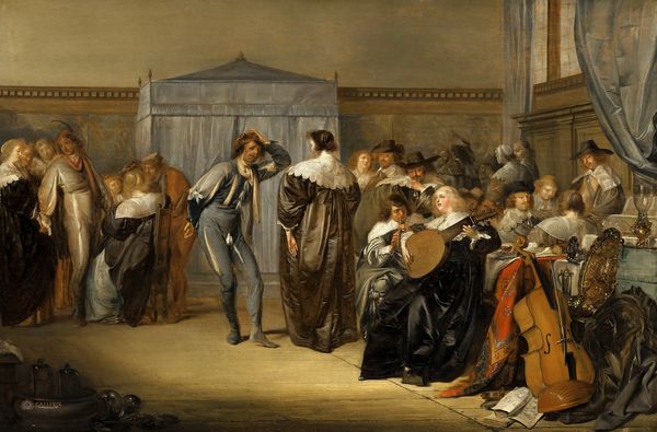 Editor: So, this is Jan Miense Molenaer's "Bauernhochzeit," or "Peasant Wedding," painted in 1659. It’s an oil painting and it immediately strikes me as incredibly dynamic. There's so much happening; a real sense of energy through the figures' gestures. What do you see in this piece? Curator: I am most drawn to the interplay of forms and the structuring of the composition. Observe how Molenaer uses a relatively shallow depth of field to compress the figures, almost like a frieze. This, in turn, heightens the surface tension, pushing the eye across the canvas in a carefully orchestrated dance. The diagonals formed by the figures’ limbs and the subtle variations in tonality further amplify the sense of movement. Note how the eye is never given a place to rest. Editor: That's interesting; I was focused on the narrative and all these individual vignettes playing out. I hadn't thought about how compressed the space is. Do you think that was intentional? Curator: Without question. Notice the careful arrangement of light and shadow – how certain figures are highlighted to draw our attention, while others recede into the background. These techniques aren't merely descriptive, but fundamentally constructive. Molenaer’s considered application of chiaroscuro actively builds a compelling and visually complex painting, emphasizing volume in the individuals depicted, without drawing from cultural interpretations. Editor: So, less about the 'who' and 'why' and more about the 'how' of the composition? I see what you mean. The eye definitely jumps around based on what he emphasizes and that changes what stands out at each view. Curator: Precisely. Through close observation, we see the essence of art isn’t about mirroring the world, but crafting an aesthetic experience through shape, light, color and form. These are intrinsic values that bear considering in Molenaer’s paintings. Editor: Okay, I think I understand a new perspective from which I can consider visual composition and spatial arrangements. Thank you for making that clear.