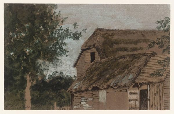 Curator: Welcome. We’re looking at "Fight at an Inn or House with a Thatched Roof on a Hill" by Josephus Augustus Knip, created sometime between 1831 and 1847. It's primarily watercolor, with elements of pencil and coloured pencil work. Editor: This looks like something straight out of a dream. Or perhaps a very vivid memory. There’s a beautiful softness, but the scene itself—that house besieged!—is fraught with anxiety. Curator: Indeed. The composition invites a deep reading. Notice how the eye is led from the serene background—that town nestled in the distance with its towering spire—to the chaos erupting around the thatched cottage. Editor: That juxtaposition, yes! It's unsettling, almost theatrical. You’ve got this rustic idyll invaded by... Well, who are they? Soldiers? Bandits? They’re just these small, shadowy figures enacting some drama we’re only glimpsing. It’s like a stage play where we missed the first act. Curator: Exactly. Consider how Knip uses the muted palette—greys, blues, ochres—to underscore the somber mood. It reflects a period where Romanticism’s emphasis on emotion intersected with the emerging genre of history painting. The figures themselves, while small, possess a dynamism; they push and pull the viewer into the heart of the conflict. Semiotically, the thatched roof can be seen as representing rural vulnerability against the encroachment of larger social forces. Editor: Or just a cozy place under attack. Maybe I'm just simple, but I see the tension between the idyllic and the violent playing out so personally. You almost feel responsible, like you should warn them, even though it’s long gone. Curator: That personal engagement speaks to Knip’s skill, though. He manages to embed broader themes into a very intimate scale. Editor: And what's so strange to me is how timeless the work feels even if we understand the context; this exact feeling will resonate every time humanity attacks a home, literally or metaphorically. The material reality of violence set against a calm horizon… it’s tragically current. Curator: I think that provides us with a rich entry point, offering much to think about beyond just formal analysis. Editor: Right! I could gaze at it all day and come up with 100 different narratives and never quite grasp the truth in this little painting. And that, in my mind, is its true beauty.