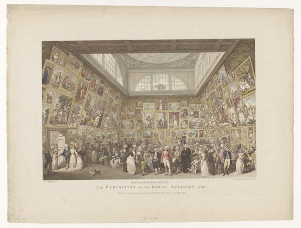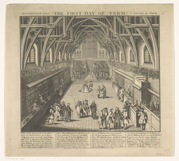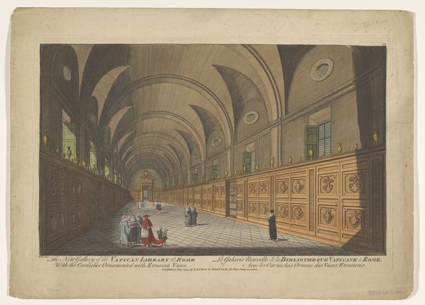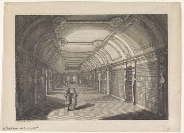 Editor: This print, "Galerij in de Vaticaanse Bibliotheek," made sometime between 1722 and 1758 by Nicolas Jean Baptiste Poilly, shows a stunning view inside the Vatican Library. It really emphasizes the building's grandeur and scale. How would you approach analyzing something like this? Curator: As a materialist, I see more than just grandeur. I see the process behind its creation, the physical labor embedded within. Consider the engraver's tools, the quality of the paper, the economic systems that allowed Poilly access to these materials and the skills needed to create this. Who was consuming these images and why? Editor: That's interesting. I was focused on the aesthetic, but you're highlighting the social and economic context of its production. So, you’re less interested in the beautiful perspective and more in who was buying and distributing it? Curator: Precisely. The "beautiful perspective" is itself a product of a specific historical moment, a particular way of seeing fostered by certain technologies and power structures. Think about the accessibility of such an image. Was this print meant to inspire awe in potential patrons, showcasing the wealth and influence of the Vatican through reproducible media? How does that impact our reading of it? Editor: I never thought about prints in terms of consumption, but it makes perfect sense. It allowed wider access to these spaces through visual reproductions. How does the Baroque style play into your materialist approach? Curator: The Baroque’s elaborate ornamentation points to available resources and a culture of conspicuous consumption. Each etched line represents skilled labor and time. Consider the detailed cornices mentioned in the title. They're not just decorative; they represent value, control over resources, and the power dynamics inherent in their creation and display. How does that perspective shift your interpretation? Editor: It definitely moves beyond just admiring the aesthetics to understanding the systems that supported its making and the intended audience. I'll never look at a print the same way again. Curator: And that, perhaps, is the first step towards understanding the complex relationship between art, labor, and society.