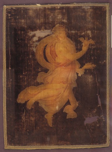 Curator: Let’s take a look at "Free Hand Decorated Wall," a watercolor drawing made around 1940 by Michael Lauretano. What strikes you first about it? Editor: Well, it’s undeniably peculiar. The figure seems poised, maybe a bit awkward, like they’re caught mid-performance in an amateur theatrical production. And the archer…Cupid after too many cocktails, perhaps? Curator: Note how Lauretano deploys watercolor to produce an effect that imitates fresco technique. The earth-toned pigments create an interesting spatial construction between figure and architectural surround. Editor: I do get the illusion of texture and aged walls. It really speaks to the classical—in a deconstructed way. It’s rough, the lines aren't precise; the whole image feels like a memory. Curator: Consider how the subject—a lone, Classical figure beneath a decaying archway, drawn with rudimentary technique—points to a kind of structural fragmentation. Editor: Yes, fragmented! Like a shattered ideal. This figure’s got a hopeful little bow, but you can see how their situation lacks wholeness. I find myself feeling wistful and amused, as if I have discovered something ancient rendered as contemporary yearning. Curator: And in that yearning we might recognize a timeless pursuit—humanity seeking balance, caught in the web of formal constraint. Editor: Exactly! Lauretano lets you see that universal aspiration, that human craving for an impossible harmony through a style of expression both artless and deeply considered. Curator: Yes, it's as though Lauretano captured something so simple yet enduring in its aesthetic design. Editor: Absolutely. It leaves me pondering how the simplest forms, rendered with the barest skill, can ignite profound feelings about this longing for what is always just beyond reach.