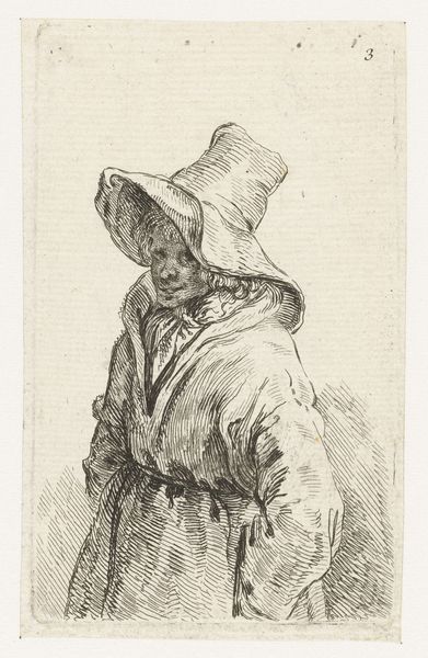 Curator: Here we have an etching by Carel de Moor the Younger, "Oude vrouw met een kapje op haar hoofd"—or "Old woman with a cap on her head." It was likely created sometime between 1665 and 1738, offering a fascinating window into Baroque portraiture through the lens of printmaking. Editor: The mood of this work is contemplative, almost melancholic. There’s a strong focus on the textures, the fabric of the headdress, the ruff around her neck. I’m struck by the lines, they’re so assertive and direct. Curator: That directness speaks to the print medium itself. Etchings allow for detailed linework. The way De Moor utilizes the medium reflects an increasing interest during that era in realism. There was a growing desire amongst both the wealthy bourgeois classes as well as nobility to have imagery that spoke more to everyday people and everyday life. Editor: Exactly, but this also opens questions of representation. Who is this woman? Is this portrait flattering or does it reduce her to a type? Is she a caricature? Curator: It is interesting you ask that. When examining artworks through a historical context, it’s very common to assess how an individual of the lower classes was publicly perceived at that time. The politics of portraiture back then heavily emphasized idealization for those of the upper classes. When focusing on genre paintings from the Baroque Era it can be easily stated that for many in the lower working classes and/or elders there was less incentive to display the people being presented through “rose colored glasses”. This allows them to express the emotional labor involved in simply going through everyday life. Editor: Absolutely. What is particularly compelling is how de Moor frames her. It evokes complex associations when seen today and forces a discussion between contemporary understanding of lived realities and history painting. This print offers a window into that period's social complexities and artistic techniques. Curator: A lasting commentary. It's pieces like these that give us pause when examining art throughout history and allow us to contemplate how it may be displayed in museum spaces. Editor: Precisely, they also spark new paths for interpreting historical images through intersectional lenses that highlight representation and difference.