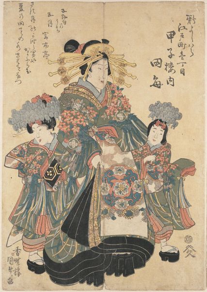 Curator: Here we see Utagawa Kunisada's woodblock print, "Courtesans with Kamuro," currently housed in the Harvard Art Museums. Editor: The somber tonality strikes me first. Despite the intricate patterns, there's a certain gravity in the composition, wouldn’t you agree? Curator: Absolutely. Consider the role of courtesans within the broader social and economic structures of Edo-period Japan. These women, often from impoverished backgrounds, were commodities but also wielded cultural influence. Editor: And how skillfully Kunisada employs line and color to create depth! Notice how the flowing black fabric grounds the image, while the delicate floral patterns add a layer of visual complexity. Curator: Let's not overlook the Kamuro, the young apprentice. Her presence is a poignant reminder of the cycle of women within this profession, perpetuating the structural imbalances of that time. Editor: Precisely. Kunisada's mastery lies in these nuanced details. The tension between the formal beauty of the print and its implicit social commentary is truly compelling.