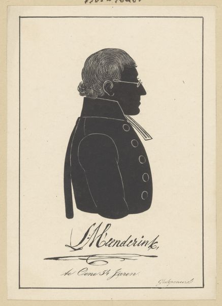 Editor: This is a graphite drawing, a silhouette portrait of Willem Carel Mauve by Pieter Barbiers the Fourth, created sometime between 1809 and 1848. It feels almost like a caricature, stripping the subject down to just an outline, but still somehow conveying information. What do you see in this piece? Curator: It’s fascinating how a silhouette, such a reduction of form, can still hold so much information. In this stark portrayal, the sharp contrast evokes the starkness of moral judgment prevalent at the time. Do you see how the very act of creating a silhouette is, in itself, an act of reduction, simplifying a person to their most essential form? Editor: Yes, I do. Almost like trying to find the "true" essence by removing the superficial. So the details that *are* included – the collar, the hair – become even more significant, right? Curator: Precisely! The meticulously rendered hair, juxtaposed against the severe jacket and collar, could signify the tensions between societal expectations and individual identity. Think about how hair has been symbolically loaded throughout history. Does that change the reading for you? Editor: Definitely. It makes me consider what details were deemed important enough to capture. And also, maybe, what aspects of identity they chose to project. Curator: That's right. Silhouette portraits gained popularity during this period as a quicker, cheaper alternative to painted miniatures, offering a glimpse into the democratisation of image-making, allowing a wider range of society to participate in portraiture. It speaks to accessibility and the broader shifts in identity. It’s almost haunting, isn't it? Editor: It really is. I never thought a silhouette could hold so much cultural weight. Thanks, I will carry that in mind.