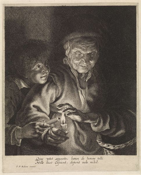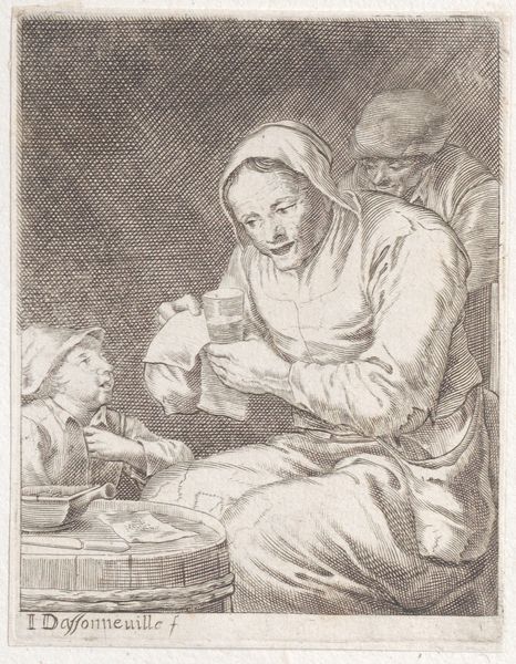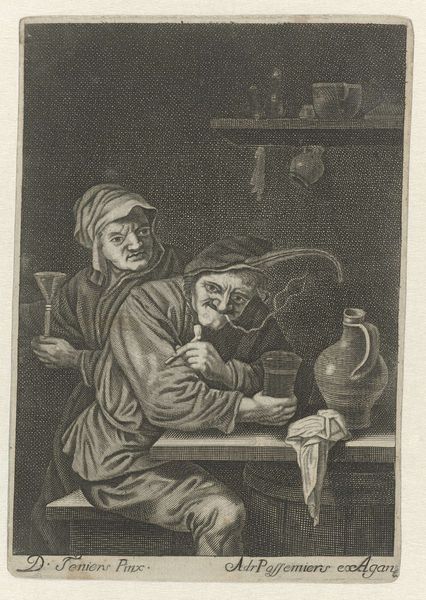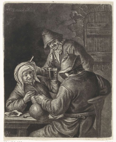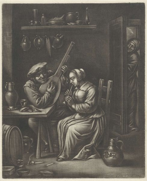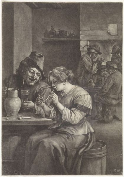 This print titled “Unequal Love” was made by Jan van Somer using the mezzotint technique. The process involves roughening a copper plate with a tool called a rocker, creating a surface that would print solid black. The artist then works back into this field of black, burnishing and scraping to create lighter areas. Notice how the velvety darks give way to soft gradations of light, capturing the scene's intimate mood. The texture created by the mezzotint technique almost seems to mimic the rough textures of the figures’ clothing and the wooden barrel. The labor-intensive nature of mezzotint meant that it was often used for reproducing paintings, making art accessible to a wider audience. Consider the social context here: the print makes an image available for consumption, but also required skilled labor to produce. In this sense, the print is an object embedded in the era's political economy. This print challenges traditional notions of fine art by highlighting the artistry involved in reproductive printmaking.