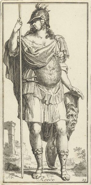 Arnold Houbraken created this engraving, "Personification of Mediocrity," likely in the late 17th or early 18th century, a time deeply influenced by classical allegories and moralizing messages. Here, Houbraken presents us with a female figure, only partially draped, leading both a lion and a sheep on leashes. The lion, traditionally a symbol of courage and strength, looks subdued and somewhat pathetic. This is juxtaposed with the sheep, often seen as docile and obedient. Together, they represent the concept of mediocrity: a state where power is tamed and conformity is valued. Houbraken, who was also a biographer, seemed deeply invested in defining the qualities of greatness and, conversely, the pitfalls of being unremarkable. Mediocrity, in this context, isn't just about lacking talent. It’s about the active suppression and misdirection of inherent potential. The woman seems to embody a cautionary figure, suggesting the dangers of complacency and the importance of striving for excellence. Think of the quiet despair of the lion, a king reduced to a pet. It invites us to consider what we might be taming or neglecting within ourselves.