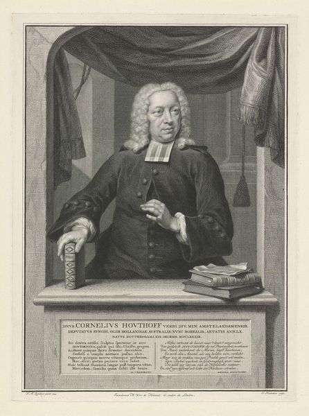 Curator: Looking at this engraving, I'm immediately struck by the intensity of the gaze. The subject seems both intellectual and supremely self-assured. Editor: Indeed. What we're observing is "Portret van James Mounsey" etched by Georg Friedrich Schmidt around 1762. It’s now part of the Rijksmuseum collection. Mounsey, you see, was a prominent physician; this image really exemplifies the relationship between image-making, power, and social status. Curator: Exactly. Considering its creation during the Enlightenment, one can't help but analyze this piece within a framework of evolving social hierarchies and identity politics. Look at the book he’s holding—it’s practically flaunting its text toward the viewer! The gesture, paired with the almost severe expression, speaks volumes about class, education, and assumed authority. Editor: His profession undoubtedly dictated much of its reception. Images like these helped build and solidify a doctor's reputation in society. That’s especially noticeable with the inclusion of scholarly tools such as books, globes, and drapery; Schmidt positions Mounsey among other esteemed academics. These symbols amplified the importance and trustworthiness of individuals working within these fields. Curator: Absolutely. It's tempting to view this portrait as merely representational, but it’s inherently an active construction. The portrait plays into societal perceptions of 18th-century male elites. Do we view him as simply a man with medical knowledge, or as an influential individual operating in service of maintaining certain social orders? How complicit are such portraits within systemic structures? Editor: That’s astute. Even the baroque-style elements enhance Mounsey’s public persona. Consider that while baroque extravagance had begun waning, its association with established power remained strong. And the visual tension—Schmidt has skillfully rendered detailed surfaces versus plain backgrounds—places further emphasis squarely on our physician. Curator: For me, that visual emphasis really amplifies questions regarding who is allowed into such constructed depictions of "greatness" and how did they function socially at the time of production? I do think these kind of critical explorations helps us dismantle older hierarchies within our art appreciation now. Editor: And understanding this engraving’s social role helps us better appreciate its artistic craft and lasting influence within broader image politics today.