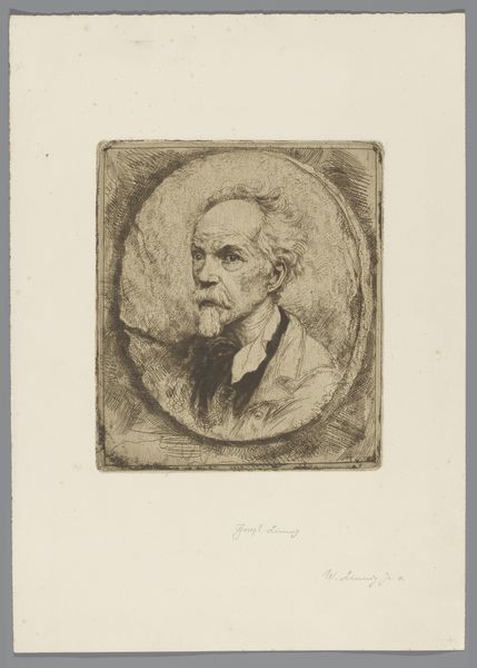 This is Jos Ratinckx's etching, "Head of an Old Man," created with delicate lines and tonal variation. The composition is simple yet powerful, focusing on the man's face framed within a rectangular boundary. The texture of the paper contrasts with the intricate detailing of the man's features and the play of light and shadow across his face. The close attention to line and texture prompts us to consider the semiotics of aging. Every etched line seems to represent a moment lived, a story etched onto his face, inviting the viewer to contemplate the passage of time. The stark contrast between light and shadow does not merely depict form but serves as a binary opposition symbolizing the duality of existence – life and death, presence and absence. The artist challenges traditional portraiture by emphasizing the process of aging and the materiality of the human condition. The linear structure and tonal contrasts encourage a deeper reflection on the nature of existence. Through the artist's careful manipulation of form, the etching becomes a profound statement on mortality and the human experience.