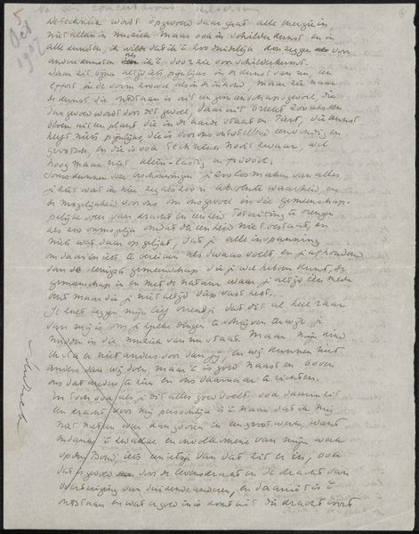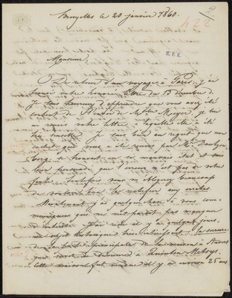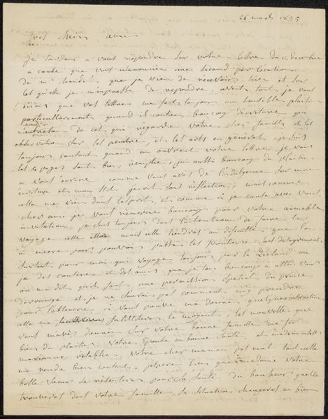 Curator: This is a letter entitled, "Brief aan Jean Zacharie Mazel," attributed to Frédéric Théodore Faber and believed to have been written around 1829. It's a drawing, penned in ink on paper, housed here at the Rijksmuseum. The artwork exemplifies Romanticism, if you consider pen on paper to be a tangible manifestation of an ephemeral thought. Editor: Ah, yes, "ephemeral" feels right. You know, looking at this letter, the first thing that strikes me is the intimacy. All these beautiful looping characters, the slightly faded ink—it feels so personal, almost voyeuristic, like we're peering over someone's shoulder reading their private thoughts. Curator: The act of letter writing itself was, and still remains in many cases, a powerful performance in a public, social context, wouldn't you say? It was very often a careful construction intended to make a distinct impression, often far from casual or spur-of-the-moment. Even in seeming to disclose secrets, one also maintains them. Editor: That's interesting, and maybe true. But all that intentionality... look at that almost frantic handwriting. I imagine someone feverishly trying to capture thoughts as they rush in. So for me it communicates anxiety! I think it's the inconsistencies of stroke and depth, maybe a touch of palimpsest... so beautiful! Curator: Perhaps it's the residue of emotional weight, as seen through the act of writing. I would be wary, though, of reading modern conceptions of privacy back into an era where letters functioned as both public and private communication. The question is how to parse interiority versus theatricality, performance. Editor: Fair point. Still, I’m drawn to the humanity in it, you know? The imperfections are so much more compelling than perfect calligraphy. It's that vulnerability, that immediacy. It transcends mere historical document and becomes a piece of the writer's soul! Curator: A carefully staged presentation of their soul, perhaps! Still, a powerful, and compelling presentation, nonetheless. Editor: Well, whatever the "truth" of it, the letter offers an amazing glimpse into another person’s mind—both intriguing to reflect upon!