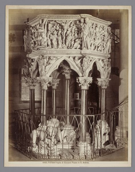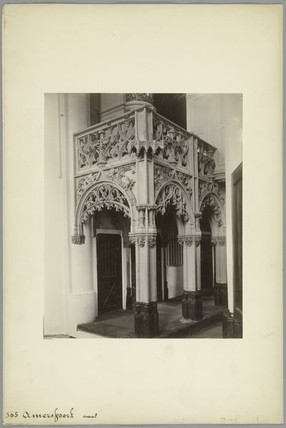 Editor: Here we have an image of a relief fireplace in the Town Hall of Bergen op Zoom, created in 1911. It appears to be made of stone, possibly marble. What immediately strikes me is the intricacy of the carvings; they're quite detailed. What can you tell me about this piece? Curator: Notice the sharp, angular cuts contrasted with the smooth finish of the columns. Consider the labor: each line a deliberate action under specific material conditions. The fireplace transforms from a utilitarian object to a symbol of wealth and power via skilled craft. What are the social implications? Editor: I guess that owning a detailed piece of craft like this would indicate you were a part of a more powerful and wealthy social class? Do the carvings represent any important local stories or mythology that we should know about? Curator: The imagery speaks to a deliberate appropriation of religious or aristocratic power. Are these original stories or appropriated? Now think about where this photograph came from. A monument conservation group, you said? Why photograph it? Editor: Maybe it's a method to catalog historical artefacts? By photographing and documenting them they can track how craft techniques evolve across eras and geographic spaces. How else can you connect production methods and cultural impacts in this case? Curator: Precisely. Now reflect on its placement, in the town hall. Who sees it? How are they meant to feel when observing it? Does it uphold an aesthetic that subtly underscores divisions based on class and craftsmanship? This piece embodies that relationship between artistic expression, material culture, and the construction of societal hierarchies. Editor: That is such an intriguing point! Thinking about craft in the frame of wealth, labor, and power opens up a whole new perspective for me. Curator: Indeed, understanding an artwork's cultural function allows for richer interpretations, unveiling how material conditions contribute to broader social structures.
