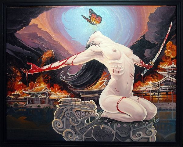 Editor: This is Dave Macdowell's 2011 acrylic painting, "Something Wicked This Way Comes." The scale is impressive, and the combination of the figure and the carousel creates such an unsettling, dreamlike effect. What elements stand out to you in this piece? Curator: The artist's precise rendering immediately commands attention. Consider how the subject is carefully positioned above the carousel, and observe the chromatic arrangement; cool tones dominate in the top half of the painting, with warm hues accenting the figure's lower body and integrating her into the carousel. Editor: I see what you mean about the warm colors. Does the swirl motif contribute to the dreamlike quality? Curator: Indeed. The repeated spiral form—evident in the clouds, the figure's 'tail,' and even the carousel ornaments—creates a visual rhythm, furthering the feeling of surrealism. Consider how the swirls lead the eye through different elements. Editor: And the figure’s pose seems deliberate, like she’s perched, about to…pounce, maybe? Curator: Precisely. The formal structure establishes a dynamic tension; it evokes both a sense of frozen stillness and imminent motion. Note how the figure and the carousel itself appear disconnected, existing in different pictorial spaces. Macdowell is very interested in surface tensions. Editor: That makes me look at the painting completely differently. I was so caught up in trying to understand what it "meant." Curator: Meaning is often less important than what the surface details can convey. Consider, the figure, though rendered with meticulous realism, feels unreal in its setting. The lack of clear narrative invites our own projection and interpretation. Editor: I appreciate you pointing out the tension in the work, especially how color and structure work together to create a world that's both beautiful and disturbing. Curator: Examining those tensions gives the work it’s edge. We are drawn in precisely because the painting doesn't offer easy answers; instead it poses complex questions of form and composition.