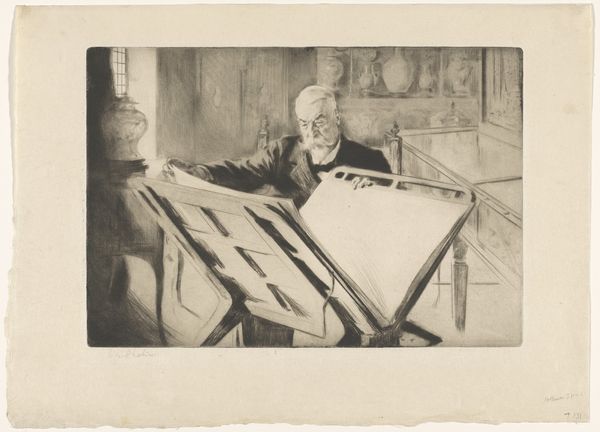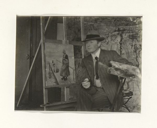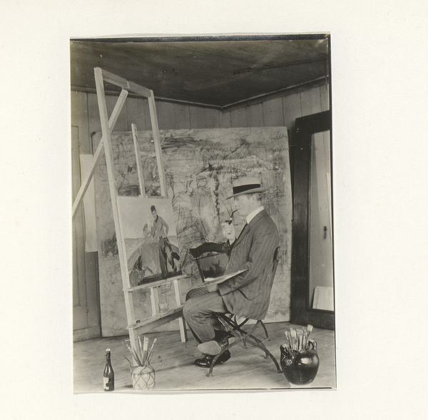 G. Hidderley’s photograph, "Man in een schildersatelier," captures a painter in his studio, a space brimming with creative energy. The monochrome palette and the soft focus give it a timeless feel. Look closely at the backdrop. It’s not just a wall; it’s a canvas itself, covered in a chaotic network of lines and shapes. It reminds me of Cy Twombly’s scribbled surfaces, where the act of mark-making becomes a dance of thought and feeling. This photograph celebrates the artist's studio as a site of endless experimentation. See how the painter’s gaze is fixed on his canvas. The photograph becomes a mirror reflecting the dynamic relationship between the artist, their materials, and their vision. Like Philip Guston said, "Painting is impure. It is the adjustment of impurity." There’s something beautiful in the messy, unresolved nature of artmaking.