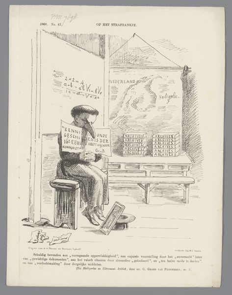This political cartoon was produced in 1872 by Johan Michaël Schmidt Crans, using a printmaking technique called lithography. A design is drawn on a flat stone with a greasy crayon, and then printed. In this case, it has created an image meant to make a political point. The focus of the cartoon is Blussé, and his relationship to income tax, represented here as a broken barrier he sits above. Lithography was a major means of mass communication at this time, rapidly adopted for newspapers, posters and other printed matter. This made it an ideal medium for political commentary, allowing artists to quickly respond to current events and circulate their views widely. Consider the labor involved: the artist's hand drawing the image, the work of preparing the lithographic stone, and the physical process of printing. This image is not just a representation, but an artifact of a specific historical moment, reflecting the social and political concerns of its time. By understanding its making, we gain deeper insight into its meaning.