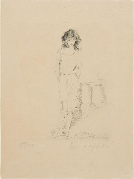 Curator: This is James Abbott McNeill Whistler's "The Draped Figure Seated," currently housed in the Harvard Art Museums. Editor: There's a wistful, almost melancholic quality to the figure; the light touch of the sketch emphasizes this mood, somehow. Curator: Exactly, the lithographic crayon on paper, combined with its modest dimensions, lends itself to a feeling of intimacy. The materiality emphasizes the fleeting nature of the pose. Editor: That flowing drapery speaks volumes. Draped figures often symbolize vulnerability, yet there's a resilience in the way she occupies space. Perhaps, the draped figure alludes to classical ideals of beauty tinged with a modern sensibility. Curator: Indeed, and the very process of lithography would have been more accessible, democratizing the reproduction of images at the time, quite challenging established hierarchies. Editor: The image lingers. It's a simple composition, but charged with meaning. Curator: Agreed, understanding the means of production and symbolic language enhances its profound impact.