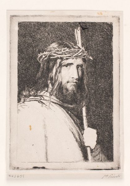 This photograph by Adrien Rosman captures a sculpture of the head of Christ, crowned with thorns. Rosman, who was born in the Netherlands in 1828, likely created this image during a period of increased interest in religious iconography. Looking at this image, it’s hard to ignore how the traditional imagery of Christ’s suffering is both reinforced and challenged. Rosman was working in a time when the role of religion in society was being questioned and re-evaluated. There is an intensity in the way that Christ's pain is shown – almost theatrical. The sculpture’s weeping face suggests vulnerability and a challenge to traditional, stoic masculinity. Rosman seems to invite us to consider Christ's humanity and suffering. The photograph reflects a society grappling with faith, identity, and the burdens of history. It prompts questions about the relationship between belief, suffering, and representation.