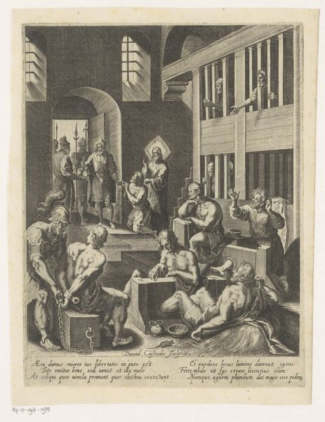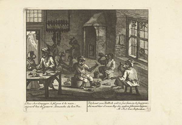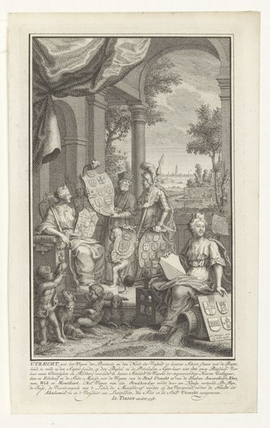 Curator: Let's take a closer look at "Allegorie op de provincie Holland," an engraving created in 1742 by Jan Caspar Philips. Editor: My first impression is that this print looks grand and important! It’s incredibly detailed for an engraving, like a stage play frozen in time. Curator: Indeed! It's bursting with symbolic imagery. Philips uses a baroque style to celebrate Holland. Observe how he meticulously renders textures; look at the fabric draping, and how the engraver captures the reflective surfaces of coins and metal objects! The labor involved is astonishing, with those fine, etched lines building form and narrative depth. Editor: Absolutely, it is the depiction of wealth that really fascinates me. Check out the coins at the base there! To me, it feels like an idealized depiction, with allegorical figures, seemingly celebrating commerce and maybe governance itself, surrounded by shields. But I wonder, who exactly was the intended consumer of such imagery? And what other means of production, beyond wealth and symbolism, are encoded in those very detailed, finely cut lines. Curator: I think it definitely speaks to the wealth and self-image that the Dutch Republic cultivated. And, from my perspective, Philips cleverly combines national pride and artistic skill. The scene unfolds like a theatrical production, with Lady Holland elevated, suggesting divine right or providence... perhaps some tongue in cheek wit is lurking. Editor: Hmmm, right, and the buildings in the backdrop feel equally staged. While "Allegorie op de provincie Holland" is rooted in history, it still resonates today. Curator: Definitely! Exploring these artworks invites us to consider themes of identity, authority, and the material foundations upon which our society rests. Editor: Absolutely. It’s through analyzing the means of making—labor, artistry, material—that these older works begin speaking directly about contemporary concerns with consumerism, and class.