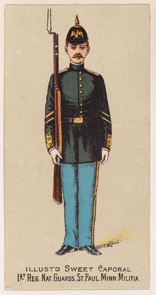 Editor: Here we have "Private, 13th Regiment, New York State Militia," a print from 1888, created by the Kinney Tobacco Company. He looks quite serious, standing at attention. I’m struck by the uniform; the color seems a little unusual for a military uniform. What do you make of this portrait? Curator: I'm immediately drawn to the context of its creation. It's not just a portrait, it's an advertisement embedded in a series about the military, meant to promote Sweet Caporal cigarettes. Consider the rise of industrial capitalism and the emerging consumer culture of the late 19th century. How are notions of masculinity, patriotism, and consumerism being intertwined here to sell tobacco? Editor: So you’re saying the image is about more than just depicting a soldier? Curator: Exactly. Think about who this image targets. Cigarette companies often associated their products with strength, virility, and adventure. Military imagery served to reinforce these associations, linking smoking to ideas of national pride and duty. How might this messaging impact recruitment or perceptions of military service? Editor: I hadn't considered the implications beyond the surface level. I suppose it glorifies the military through this idealized image of a soldier, while simultaneously working as advertisement. Curator: It's a visual manifestation of power structures at play. Moreover, we must consider the absence of diverse representation within this historical record. The promotion of idealized masculine figures and military service may also be inadvertently upholding harmful norms. Where are the images that challenge these stereotypes? What alternative narratives are silenced? Editor: This really shifts my understanding of the piece. It's not just a portrait, it's a piece of propaganda within a broader cultural narrative. Curator: Precisely. By examining art through an intersectional lens, we can expose these power dynamics and better understand their impact on society, both then and now.