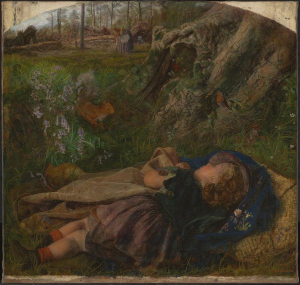 Albrecht Anker likely painted this image of a sleeping girl in the late 19th century. She is lying amongst the foliage in a forest next to some gathered wood. The image conjures the fairy-tale world of peasant children gathering wood and encountering wolves in the forest, but in reality, the labour of children was a serious feature of 19th century rural society, especially in a relatively poor country like Switzerland. This artistic depiction softens the reality of peasant labour by portraying this young girl asleep on the job, resting from work. The artistic style here derives from Realism, however there is a romanticism and a softness in the way this girl is sleeping peacefully with bare feet, suggesting a prelapsarian innocence. When looking at images like this, it's always useful to know the artist's background, to understand the role that patronage played, and to be aware of the socio-economic conditions of the time. This helps us to situate the image within the complex history of social relations.