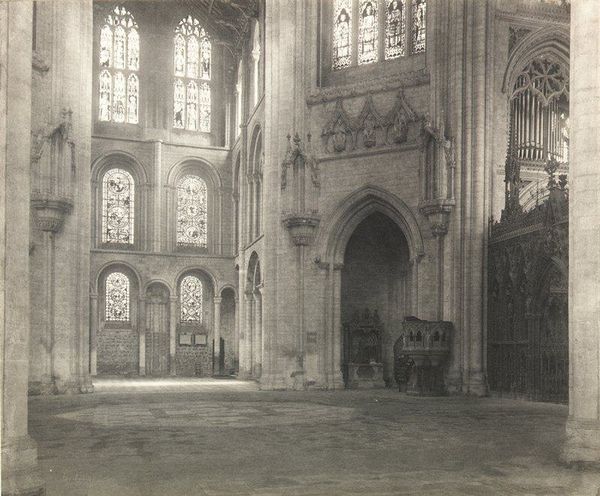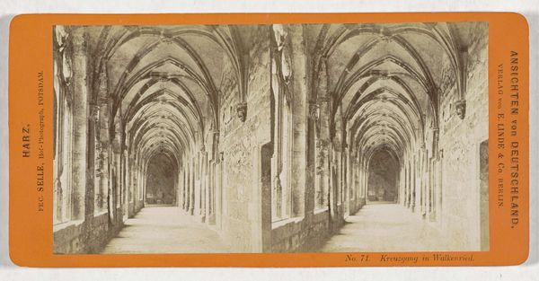 Curator: This is an intriguing, untitled photograph by Iorwerth Grey Lloyd, currently held at the Harvard Art Museums. The dimensions are roughly 28 by 22 centimeters. Editor: My first impression is one of austere grandeur, but also desolation. The scale is impressive, yet the warm sepia tones evoke a sense of something lost, something ancient. Curator: Precisely. The image presents an unidentified interior, dominated by a vaulted ceiling and a rhythmic succession of arches. The historical context is key; architectural photography like this gained prominence in the 19th century, reflecting growing interest in documenting historical sites. Editor: The arches! They are more than just structural elements; each is a gateway, promising transcendence. But the scaffolding visible through the far arch also implies a vulnerability, a building undergoing restoration. This suggests a cycle of destruction and reconstruction that echoes human experience. Curator: It's interesting you mention vulnerability. This photograph, in its own way, participates in the preservation of cultural heritage. The photographic medium allows us to disseminate such images widely, creating a public investment in their maintenance. Editor: Indeed. Even without knowing the specific location, the image resonates on a symbolic level. It reminds us of the power of shared cultural spaces. Curator: Absolutely. Lloyd's photograph is not simply documentation. It prompts questions about preservation, cultural memory, and our relationship with the past. Editor: A silent witness, inviting contemplation on time's passage and the enduring strength of the human spirit.