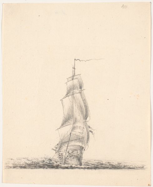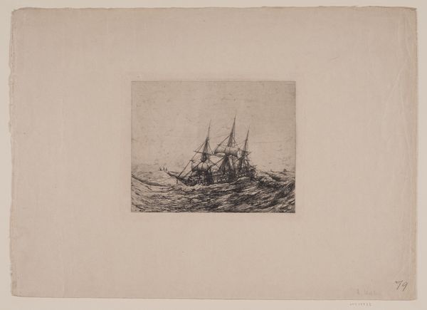 Anton Melbye made this line drawing of a ship at sea, sometime in the mid-19th century, using etching techniques. The image speaks to the importance of naval power and maritime trade in the social and economic life of Denmark at that time. Consider the role that institutions played in shaping artistic styles. Melbye was trained as a marine painter, and he lived and worked in a time when seascapes were a popular and respected genre. The Royal Danish Academy of Fine Arts, for example, promoted traditional artistic values and contributed to the development of a distinctive Danish artistic identity. Meanwhile, Denmark's naval fleet played a key role in protecting the country's commercial interests and maintaining its status as a regional power. Melbye's images contributed to a sense of national pride and maritime power. Historians can learn more about this image by researching the history of the Danish navy, the development of maritime trade, and the artistic conventions of seascape painting. The image itself is evidence of the complex and contested relationship between art, power, and social identity.