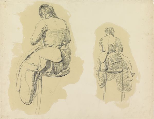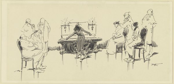 Editor: Here we have Peter Hansen's ink drawing, "Copy after Antique Fresco in the Museum in Naples. Music Scene," created sometime between 1829 and 1899. It feels like a sketch, capturing a moment, but the composition is quite intriguing. What catches your eye, initially? Curator: Immediately, I am drawn to the economy of line. Notice how Hansen uses thin, precise marks to delineate form and space. The lack of shading forces us to concentrate on the relationships between the figures. Consider the dynamic tension created by the positioning of the musicians – one seated, another standing – and how that impacts our interpretation of the 'scene'. Editor: Yes, and the grouping of the figures on the left; they’re almost ghost-like in their unfinished quality. How does the artist make a reference to a fresco and ancient scene here using mainly just lines? Curator: By stripping away extraneous details and emphasizing structure. He highlights what is, and removes that which would add superficial information. The focus on linework allows him to emulate a sense of age and historical distance. Think of faded frescoes where the color has eroded away, leaving only the skeletal structure. Editor: That’s fascinating. The simplification is key. Are there particular aspects of the composition or rendering that speak to you beyond its representation of an "ancient" artwork? Curator: The angles and perspective are intentionally flattened. The artist focuses not on realistic perspective or composition but what constitutes an understandable two-dimensional construction and interplay of elements. The line is primary to the scene represented. It acts not only to describe an idea but the structural element of its reconstruction by the artist. Editor: This close examination has changed how I see the sketch; it’s less a copy and more a study of form and technique. Thank you for clarifying how Hansen emphasizes those elements! Curator: Precisely. Hopefully it highlighted how form dictates content, not the other way around.