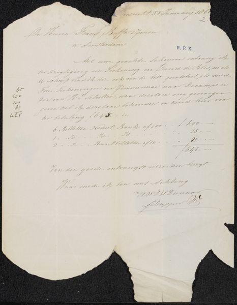 Curator: This is a drawing in ink on paper by Salomon Leonardus Verveer. The Rijksmuseum holds "Brief aan de Commissie van de Tentoonstelling van Levende Meesters in Utrecht," likely drafted sometime between 1831 and 1833. Editor: It looks so fragile! I immediately notice the handwritten script covering the aged paper, almost like it might crumble if touched. The pressure applied when writing with ink has definitely aged the paper, almost etching the letters. Curator: Considering the period, its medium becomes inherently intertwined with notions of literacy, class, and access to resources. A letter signifies an exchange, a power dynamic – in this case, the artist petitioning the commission. Editor: And who was writing letters? A letter emphasizes a time of different speeds, and labor. Now communication, in most spaces is at lightning speed, and this seems far more permanent, especially compared to digital communications today. Curator: Precisely. Furthermore, the Dutch Golden Age heavily influenced artists, yet Romanticism took root later, coloring their expressions with subjective emotion. You see that tension here: a formal request, steeped in artistry and personal ambition, reflects a broader cultural narrative of artistic self-determination. Editor: The artistry in just a letter to an exhibition commission is very interesting; now applications are largely digital with very clean fonts and I think we're missing out! Curator: That’s a great observation. This very act, applying ink to paper, negotiating patronage, was itself a material declaration of an artist’s labor and agency within the economic and social systems. Editor: There is just so much we are missing in the current landscape, even just looking at the process and artistry of sending in an art application is very interesting. Curator: Right? Reflecting on this piece now, I’m left considering all the unwritten rules Verveer had to navigate—and all the unseen hands involved in art creation back then. Editor: And I just can’t shake how this singular sheet encapsulates so much: craft, communication, labor—a testament to slowing down and observing closely.