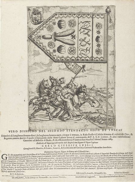 This anonymous print from 1742, titled "Oostenrijkse overwinning op de Fransen, 1742," presents a bird’s-eye view of battle and victory. The composition is divided horizontally, with the upper register dominated by an equestrian figure and text, while the lower shows a siege. The formal arrangement invites us to decode its visual structure as a commentary on power and territorial struggle. The placement of the general on horseback above the siege underscores a hierarchy of command, while the circular layout of the encampment below suggests confinement. This is in stark contrast to the general and his horse who have broken free of the constraints of the lower panel. The lines in the prints are decisive, creating a sense of stark drama, and the text acts as a semiotic anchor, providing a narrative frame that guides our interpretation of the visual elements.