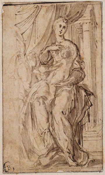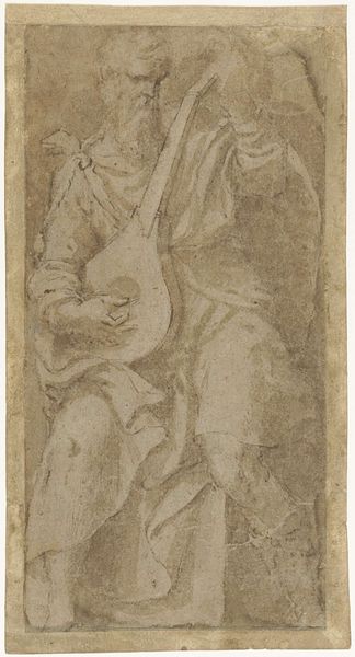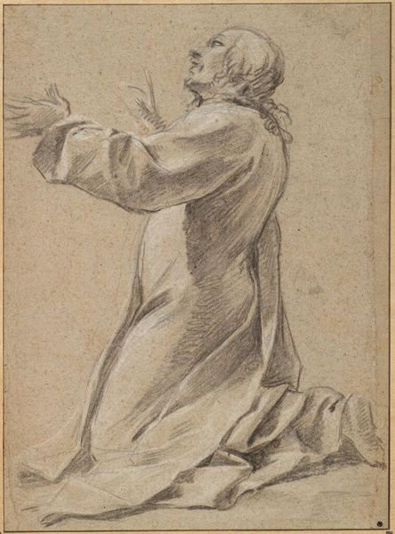 Editor: Here we have Giorgio Vasari's "A Figure of a Man in Draped Cloak." It's an arresting sketch, full of texture. What can you tell me about it? Curator: Considering Vasari's context, his artistic production catered to a specific class. This drawing, a study perhaps, reveals the labor and process usually concealed by the finished artwork. What does the materiality of the chalk suggest to you about its accessibility? Editor: It does seem like a readily available medium, almost democratic. This makes me reconsider Vasari's place in art history. Thank you. Curator: Indeed. Examining art through its material means allows us to question established hierarchies and appreciate the diverse forms of creative labor.