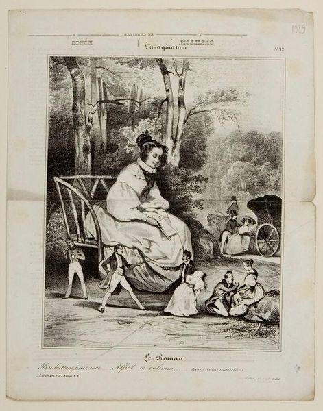 Editor: This is Paul Gavarni's "Dodophe et Titine," from the Harvard Art Museums. It's a charming scene, but the way the figures are rendered, especially their clothing, feels very detailed and almost manufactured. What strikes you about it? Curator: Considering Gavarni's background in industrial design, I look at the lithograph as a product of its time. The mass-produced nature of prints made art accessible, reflecting the rise of consumer culture. How does the depiction of leisure here intersect with the labor involved in creating these fashionable clothes and the print itself? Editor: That's a great point; it brings a whole new layer to the image. I hadn't considered the socioeconomic implications of their attire and its reproduction. Thanks! Curator: It recontextualizes "leisure" itself, doesn't it?