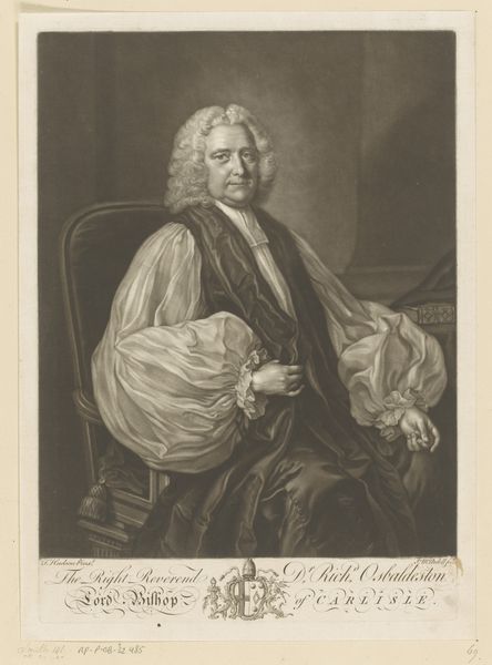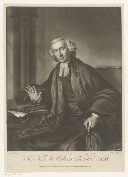 This is James McArdell's 1754 mezzotint portrait of John Nicoll, now held in the Rijksmuseum collection. The image operates within the well-established visual codes of eighteenth-century portraiture. Nicoll, a Doctor of Divinity and Prebendary of Westminster, is depicted with the trappings of his office: clerical robes, a neatly styled wig, and a book, likely of religious significance. The print was produced in England, a time of significant social stratification and religious conservatism. The Church of England held considerable power, and portraits like this one served to reinforce the status and authority of its members. Nicoll's confident gaze and dignified posture speak to his position within this hierarchy, reflecting a society where religious and academic credentials conveyed considerable social capital. Understanding this image requires more than just aesthetic appreciation. We can delve into the history of the Church of England, explore the social role of the clergy, and examine the conventions of portraiture in Georgian England. This kind of research allows us to understand art as a product of, and a commentary on, its time.