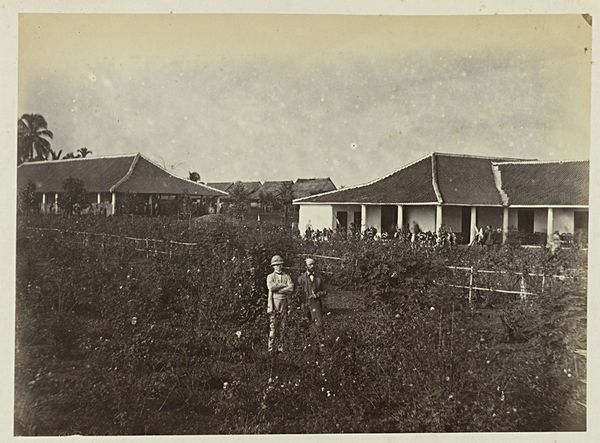 This evocative photograph, "Huis met tuin" by Woodbury & Page, presents a scene where light and shadow play to articulate depth and form. The monochromatic palette encourages us to focus on the textures and shapes that define the composition. The house is structured with a distinct linear perspective, drawing the eye along the roofline and towards the vanishing point. The garden, framed by a low fence, creates a foreground that contrasts with the solidity of the building. The shadows cast by the trees and the house itself add a layer of complexity, highlighting the interplay between natural and constructed environments. The figures present are integral to the photograph, offering scale and suggesting narrative elements within this carefully arranged space. The textural details in the foliage and the building materials contribute to a rich visual experience, challenging the viewer to consider the relationship between structure and nature. This tension invites contemplation on how constructed spaces interact with the surrounding world, a theme still relevant today.