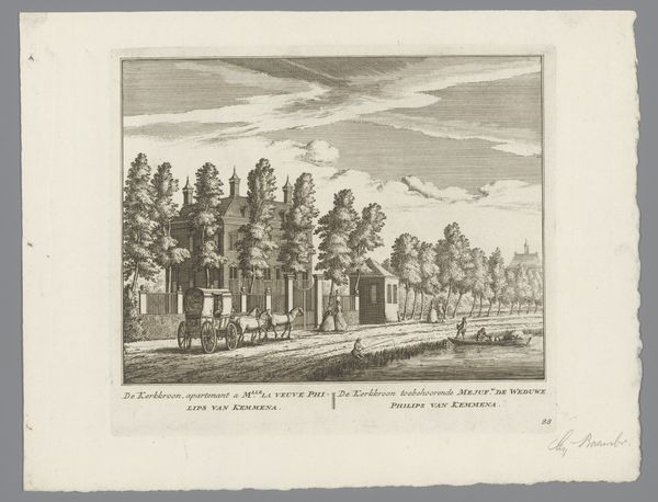Editor: This is *Gezicht op de buitenplaats Zorgvrij*, an engraving made between 1725 and 1730 by Leonard Schenk. It depicts a stately home. What strikes me is how much emphasis is placed on the land and property; it's more than just a building portrait. What are your thoughts? Curator: Indeed. We see here a carefully constructed image designed to project social status and power. The choice to present it as a 'gezicht', a view, is crucial. It's not merely depicting architecture, but an entire cultivated landscape, a visual representation of ownership and control. Consider where this image might have circulated – perhaps among potential buyers or as a symbol of achievement. How does this inform our understanding of Dutch society at that time? Editor: So, it's like advertising prestige? I hadn't considered its use. It looks serene on the surface. Curator: Precisely. Serenity, but also calculated self-promotion. The estate's design is probably a deliberate manipulation of nature into art, a fashion at that time and is presented to a particular audience. Consider the almost staged activities of the figures. How might their placement within the image contribute to the overall message? Editor: They are sort of... posing, almost like staffage. The people really give it context. It feels as if the engraving's audience are meant to appreciate the efficiency or elegance of life on the estate, everyone in their rightful place. Curator: Exactly. Now, think about the engraving as a commodity itself. Who commissioned it? What social role did images like these play in shaping perceptions of wealth and class in the Dutch Republic? What do we really know about how art impacted social structure back then? Editor: I'm starting to view this not just as art, but as a kind of historical document that says so much more about the values of that era. Thanks! Curator: An excellent observation! Thinking about art as enmeshed within socio-political systems changes how we appreciate images and objects of this period.