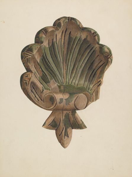 Edna Rex’s watercolor titled "Calash" presents a striking image of a woman's bonnet, dominated by a lush, consistent green hue. The eye is immediately drawn to the bonnet’s ribbed structure, its parallel lines creating a sense of depth and texture. The formal composition is cleverly simple, highlighting the calash against a neutral background. This emphasizes the bonnet’s shape and its intricate folds and curves. Rex uses light and shadow to give volume to the folds of the fabric, rendering it almost sculptural. Semiotically, the bonnet acts as a signifier of femininity, domesticity, and perhaps even constraint. By isolating this object, Rex invites us to consider the historical and cultural context of such garments. The bonnet becomes more than just a piece of clothing; it serves as a cultural artifact loaded with meaning. This close examination reflects a broader artistic interest in elevating the mundane to a subject worthy of contemplation. The monochromatic palette further focuses our attention on form and structure.