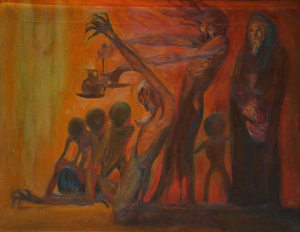Curator: Leonora Carrington’s “Untitled” presents a strangely captivating scene rendered primarily in oil paint. What's your first take on it? Editor: It feels like stepping into a fever dream—the dominating red hue, the elongated figures... almost unsettling, but strangely magnetic. The textural application of paint, especially on the figures, also draws my attention. Curator: Absolutely. The almost monochromatic red, achieved most likely by mixing multiple pigments and layering, certainly amplifies the painting’s surreal atmosphere, echoing some of Carrington’s biographical details and sociopolitical context of her life as a refugee and exile after World War II. The scarcity of colors really spotlights her creative processing when using raw material and art medium. Editor: That's interesting because, even in this fantasy setting, the very composition has something theatrical, with its backdrop and the figures. There are layers within layers. Who were her likely viewers during that time? Would her social commentary reach all societal classes? Curator: Well, given Carrington's association with the Surrealist movement and her elite background, the likely early viewers might have been other artists, wealthy patrons of the arts and intellectual circles already questioning society conventions. However, as Surrealism engaged with popular culture and with new ideologies emerging, this piece now offers much more broader social understanding of the art as we can analyze it and reflect through institutional and private museum collections. And that red becomes quite powerful as the main actor there, almost imposing, even. Editor: It makes sense how you mention red pigment choices because I feel the weight and emotional charge of the painting stems so directly from this colour. What would it tell us about access and sourcing pigments, like red ochre or vermillion for example? What social dynamics could be expressed in relation to resources availability and material’s worth? Curator: That's a good question. Access to specific pigments during the period, and Carrington's potential material choices certainly influenced the chromatic landscape, and added a narrative of labor and commercial networks around her. Editor: So, this “Untitled” piece becomes not just a painting, but a historical artefact, really, capturing an economic moment of postwar reality through art material availability? Curator: Precisely. And perhaps it offers a peek into her own resourcefulness as well. Editor: Exactly. Analyzing the materiality used really adds another layer for understanding historical artworks beyond imagery and narratives displayed. Curator: Right! This Carrington shows that there’s plenty more to explore behind what's explicitly depicted.