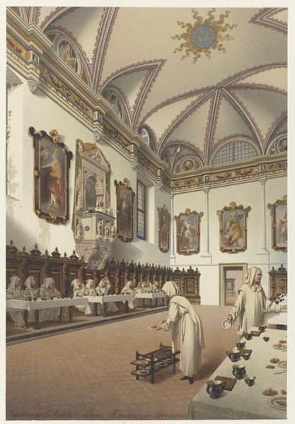 Editor: This is Luis Paret y Alcázar's "Jura de Fernando VII como príncipe de Asturias," an oil painting from 1791. It depicts a grand, ornate space filled with people, but the overall feeling is rather cold and formal. How do you interpret this work? Curator: The chilliness you perceive speaks volumes. Consider the painting’s context: it's a depiction of power, yes, but also of a monarchy on the cusp of enormous upheaval. The ceremony itself is staged within a highly controlled, even theatrical, setting. We need to ask: whose interests are being served by this performance? Who is included, and more importantly, who is excluded from this representation of power? Editor: So, it's less about the actual event and more about the image of the monarchy being projected? Curator: Exactly. Paret, even while seemingly documenting a historical moment, is constructing a narrative. Think about the meticulous detail given to the architecture versus the somewhat generic portrayal of the individual figures. Where does the painting invite your eye to linger and what does this highlight about its message? Consider the building in relationship to the historical moment of political struggle and social hierarchies in the lead up to the Napoleonic wars. How complicit do you consider the artist? Editor: It does seem like the grandeur of the architecture overshadows the people. And the whole thing feels incredibly… staged, almost as if everyone is performing their role. The details aren’t personal. Curator: Precisely! And who benefits from such rigid staging? The Crown. What is visible versus what remains hidden speaks volumes about power. By acknowledging that tension between spectacle and political reality, we move beyond simply admiring the painting's technical skill. We instead examine its role in perpetuating—or perhaps, even subtly questioning—the power dynamics of its time. Editor: I never considered the idea of looking at this image from a contemporary, theoretical perspective. It changes everything. Curator: Indeed. Art doesn’t exist in a vacuum. Engaging with art history alongside current theory reveals so much more about the conversations artworks can stimulate.