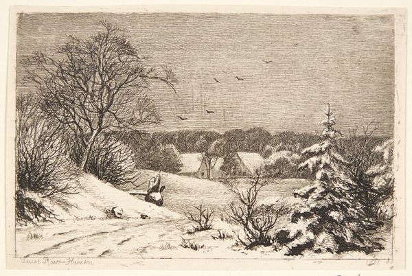 Curator: This watercolor, known as "Winterlandschap," was completed in 1888 by Jan Daniël Cornelis Carel Willem baron de Constant Rebecque. Editor: A hush falls over me when I view this painting. It is serene but also desolate, almost unnervingly quiet. Curator: The masterful handling of the watercolor medium allows the baron to depict the subtle gradations of light on snow, truly capturing a winter day's unique atmosphere. Observe how he employs layering techniques to suggest depth and texture in the forest. Editor: It feels so much colder just looking at it. Winter landscapes are rarely just pretty scenes, they reflect the realities of the marginalized. Do these muted colors hint at a socioeconomic reality, the vulnerability to climate, the necessity for shelter and community against the elements? Who do you imagine inhabited that small structure at the vanishing point? Curator: From a formal perspective, I see how the artist created a powerful compositional structure. The diagonal recession, balanced asymmetrical arrangement of trees, and the horizon line contribute to the impression of distance and, of course, scale. Notice, too, how the limited color palette enhances the overall sense of unity and harmony within the work. Editor: That cottage beckons... the barren trees could signify lives put on hold by hardship and socioeconomic disparities prevalent across 19th century agrarian societies in Europe. Was it a family's only retreat from weather and class struggle, I wonder? Or even a lonely metaphor of isolation and displacement of populations caused by evolving rural economies at that time? Curator: While it might be possible to analyze it sociologically, its real value comes from the artist's acute observation of light, shade, and textural subtlety. Editor: Understanding art demands that we think critically about both aesthetic choices *and* historical moments. Both converge in the making, reading, and lived experience of art. The aesthetic is almost *always* ideological. Curator: Perhaps, yet the inherent value still comes from understanding technical craft. Still, both approaches enable viewers to form richer engagements, I suppose. Editor: A beautiful thing, for sure.
