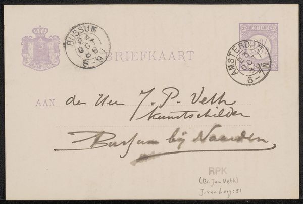Curator: This intriguing piece is entitled "Briefkaart aan Philip Zilcken," potentially dating back to 1894, crafted by Jacob Nicolaas van Hall. It's primarily executed in pen and ink on paper. Editor: Immediately, I am struck by the elegance of the handwriting. It creates an immediate impression of formality and delicacy, even if its function is quite mundane. The paper itself looks incredibly aged, soft, a sort of palimpsest. Curator: Indeed. The calligraphic style provides a window into the aesthetic sensibilities of the time, with its flowing lines and disciplined forms. Semiotically, the script performs not just to communicate the text, but embodies and projects refined sophistication. Editor: Considering its context, the postcard as a medium became quite popular for casual correspondence at this time, serving as quick communication while simultaneously functioning as a small collectible. It represents a unique moment in the intersection of art and everyday life; the messages themselves may have been rather unimportant but we can speculate on van Hall's position within an artistic circle. Curator: Van Hall was a well-regarded figure, associated with artistic circles within the Netherlands at the time. So what he has recorded and selected, formally, bears attention. Note the precise control of line weight, as each word assumes a particular balance in tone and in its weight of appearance. It's not just legible, it strives for visual refinement. Editor: And it's addressed to Philip Zilcken, an artist and art critic himself, suggesting an artistic dialogue of some kind, a message shared among cultural elites. Also, observe the placement of stamps and postal markings; they’re incorporated without disrupting the composition’s overall aesthetic, acting like a minimalist collage element. The postal system, as a developing network, also plays a central part in disseminating artistic thought through publications and other printed materials at that period in European culture. Curator: Yes, the markings act almost like compositional elements, anchoring the upper-right visually, and their haphazard, aged placement contrasts well against the deliberately presented address. The work’s formal elements successfully integrate this utilitarian function. Editor: Considering its cultural importance, it makes you wonder about the lives and dialogues woven into what we might dismiss as commonplace objects. I’m more compelled by its narrative potential—its intimate relationship with its creator and the society in which it was crafted. Curator: A telling and formally sophisticated slice of history; well observed!