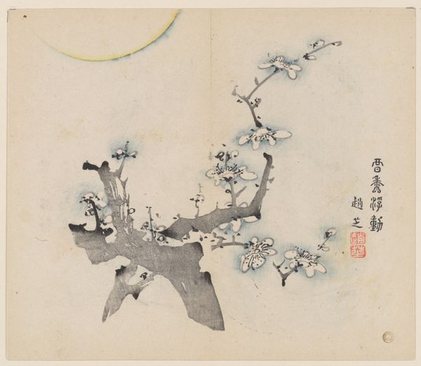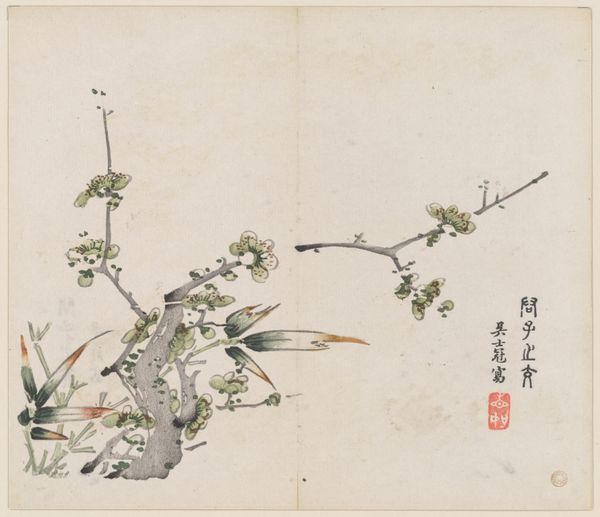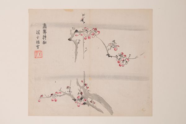 This is a page from *The Ten Bamboo Studio Manual of Painting and Calligraphy*, created by Hu Zhengyan during the late Ming Dynasty in China. This manual served not only as a guide for aspiring artists, but also as a statement of cultural identity in a time of political transition. Zhengyan lived through the collapse of the Ming Dynasty, an era marked by social upheaval. This context deeply influenced his artistic practice. The plum blossom, rendered here with delicate strokes and subtle color gradations, was a symbol of resilience and renewal. Within the traditional arts, calligraphy and painting were seen as practices that cultivated personal expression and moral character. In a society structured by rigid class hierarchies, artistic expression offered avenues for individual agency. Manuals such as this one democratized art making, but also standardized what was considered 'appropriate' subject matter. This image embodies a convergence of personal sentiment, cultural values, and societal norms that speak volumes about identity formation during times of change.
