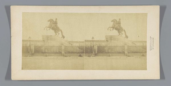 Curator: This is an albumen print of the Fontana dei Dioscuri on the Piazza del Quirinale in Rome, dating from between 1850 and 1880, created by Giuliano Ansiglioni Ottico. Editor: Immediately, I'm struck by how still and silent it feels, despite being a busy public space. The muted tones contribute to a dreamlike timelessness, like a forgotten Roman vista. Curator: It's a compelling depiction of civic pride, aligning perfectly with the era's fascination with realism, while also reinforcing the public perception of Rome as a cultural beacon through neoclassicism and its ties to Greek and Roman art. Note how the perspective guides the viewer into the heart of the piazza, emphasizing the monumentality of the Dioscuri. Editor: Absolutely, the statues themselves become powerful symbols of idealized strength and heroic virtue. The figures with their steeds seem to represent something beyond mere physical power, more like spiritual guides or guardians, placed purposefully next to that towering obelisk which reaches up toward enlightenment. The Dioscuri as connectors of the earthly and the divine. Curator: That elevation certainly reflects the Church’s political maneuvering, to Christianize a prior, pagan, symbolic space, literally building on what came before. In that vein, photography like this helped disseminate classical ideals to a broader public, reinforcing Rome's role as the epicentre of cultural authority across Europe. Editor: I find myself thinking about how people in the 19th century viewed this image. Were they more focused on the accuracy of the representation, or did they appreciate the deeper symbolic meanings rooted in classical mythology, like you said, those persistent links of culture throughout the times? This work shows how art carries more cultural and psychological weight than you expect. Curator: It served a dual purpose: both to educate and to celebrate a specific social and cultural identity. That makes it more potent and gives photography an active social role beyond simply documentation. Editor: Reflecting on our discussion, this image reveals that symbols don’t exist in a vacuum, but are embedded in and shaped by historical moments. They accumulate layers of meaning. Curator: And that act of accumulation reveals how intertwined art, politics, and cultural identity truly are, which continues to resonate into our own time.