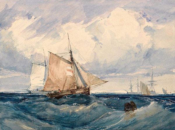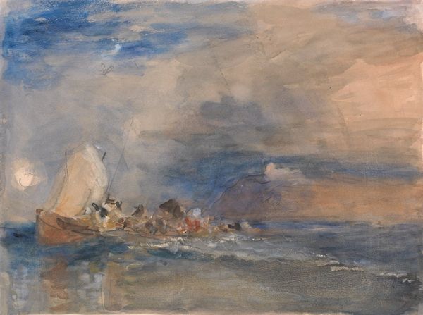 Editor: Here we have Turner’s "A Paddle-steamer in a Storm," dating from about 1841. It seems to be worked primarily in watercolor. I find it quite dramatic and unsettling, like nature's about to swallow that tiny steamboat whole. What strikes you when you look at this work? Curator: Formally, what arrests my attention is the dissolution of solid form. Consider the blurring of the boundaries between the sky and sea. The pigment seems less applied, more exhaled onto the surface. Note also the indistinct mass of the steamer, a series of calligraphic marks hinting at rather than defining structure. Editor: So, it’s almost like the storm itself is the subject, more so than the ship? Curator: Precisely. The conventional subject, a boat, serves more as a foil. Turner here presents us with an essay on the power, or the sublime, invested in a seascape; a pure essay in formal equivalence between external weather and internal, psychological experience. Note how he deployed loose brushwork to describe churning clouds, contrasting their opacity with the transparent washes in the sea below. Editor: The way you describe the paint application, especially exhaled, is very evocative. It emphasizes the immediate feeling of the work, rather than any precise rendering. I also see what you mean about formal equivalence—that’s a great way to put it! Curator: Turner, in his masterful stroke, transforms mere visual elements into carriers of emotive power. We understand a formal study of the materiality that invites us into a state of heightened receptivity and thought.