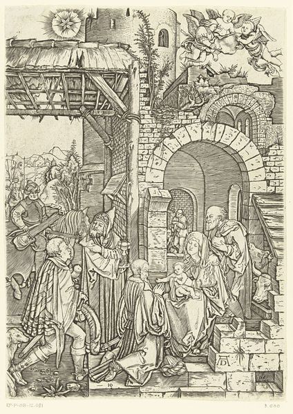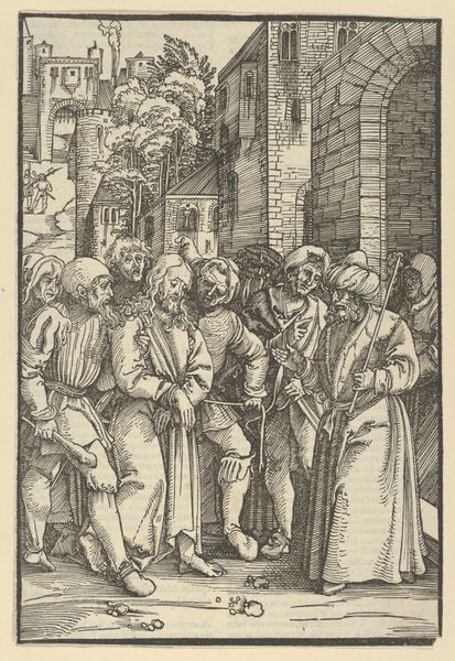 Editor: So, this is "The Dispute in the Temple" by Albrecht Altdorfer, made between 1508 and 1518. It's a woodcut, part of a larger series. The contrast between light and shadow creates a really dramatic scene. What's your take on it? Curator: What strikes me is how Altdorfer uses this biblical scene to subtly critique power dynamics within religious institutions of his time. Look at the positioning of Jesus, almost lost amidst the scholars. Do you see how that might reflect the Reformist ideas circulating then, questioning the established Church’s authority and access to religious knowledge? Editor: I see what you mean. He’s not the central figure compositionally, even though the story focuses on him. Curator: Exactly. The setting, although a temple, feels almost claustrophobic, which furthers this feeling of stifled spiritual expression. What kind of social and religious functions would this work have served when prints became popular means to spread narratives, accessible to broader audiences outside the elite circles? Editor: I guess it offered a way to access religious stories and potentially form your own interpretations, separate from the Church’s doctrine? Curator: Precisely. Consider how such accessible imagery fueled independent thought. Altdorfer’s visual narrative invited its viewers into this challenging theological landscape, providing them not only stories, but also opportunities to question their socio-political-religious reality. Editor: That gives the work a whole new layer of meaning, thinking about the agency it gave to ordinary people. Curator: Indeed. Art doesn’t just reflect history; it can also become an instrument of social change. Editor: It’s fascinating how a woodcut can be so politically charged. Thanks!