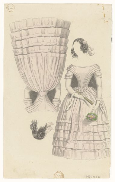 This paper cutout delicately portrays a fashionable woman, rendered in gentle greens and whites. Her layered skirts and lace bonnet, common in the mid-19th century, speak to a society keenly aware of status and propriety. Yet, the faceless void beneath the bonnet evokes something deeper. This absence mirrors the ancient Roman tradition of the "imago," a death mask representing ancestors, carried in funeral processions. The "imago" served as a potent symbol of lineage, reminding viewers of the cyclical nature of life and death. Here, the blank face invites a similar contemplation. Is it merely an unfinished doll, or does it tap into our primal anxieties about identity and mortality? Perhaps the artist, consciously or unconsciously, embedded a memento mori within this fashionable form. The recurring motif of the veiled figure throughout art history reminds us of the enduring human fascination with the hidden and the unknowable. This image is not merely a fashion plate, but a subtle meditation on the ephemerality of life and the persistence of memory.
