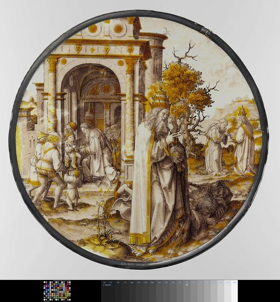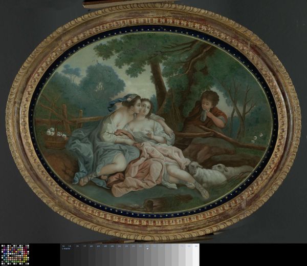 Editor: This tempera painting is titled "Two Fête Galante Scenes," created around 1795 by an anonymous artist. It's hard to ignore the dreamlike quality of the figures, especially the person seemingly asleep or perhaps ill, nestled amongst what seems to be an exotic landscape. What catches your eye when you look at it? Curator: Formally, the arrangement adheres to established principles of composition prevalent during the late Rococo and early Neoclassical periods. Notice the oval format and how it dictates a certain visual harmony. Observe the palette - soft pastels dominate, a deliberate choice to evoke a sense of refinement and elegance. Editor: So, the color choices aren't just about aesthetics? Curator: Precisely. The pastel hues contribute to the artwork’s overall atmosphere. Consider also the figuration; idealized bodies are draped in classical garb. They are strategically placed to lead the eye. Tell me, what do you make of the texture rendered using tempera? Editor: Well, tempera often gives a matte finish... Here, that flatness accentuates the figures, almost as if they are reliefs applied to a shallow background. Curator: Good observation. How might you describe the way the bodies are painted? Editor: Smooth and almost porcelain-like...it reminds me a little of... Curator: A carefully constructed surface, absent of aggressive brushwork. Any expressive marks or visible emotion might ruin the sense of order. This visual and conceptual emphasis shows commitment to technique above perhaps capturing any immediate expression or sensation. The medium becomes part of the message. Editor: This has totally changed my view. I was stuck on the subject, but now the surface, texture and form become key. Curator: Precisely. Sometimes it is a more careful examination of form that helps to unlock content.