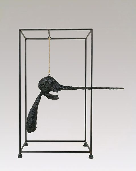 Editor: This sculpture is Louise Bourgeois' "Hanging Janus with Jacket" from 1968, made of metal. I find the biomorphic forms and the hanging position slightly unsettling, but also fascinating. How do you interpret this work? Curator: The hanging position immediately evokes a sense of vulnerability, doesn't it? Consider Janus, the Roman god of beginnings and transitions, often depicted with two faces looking in opposite directions. What aspects of transition might Bourgeois be exploring here through this form? Editor: Maybe the transition from one state of being to another, or perhaps the duality within ourselves? Curator: Precisely! The sculpture plays with duality. Note the jacket-like form draped over more overtly sexualized shapes. What do you make of this juxtaposition of protection and exposure? Bourgeois often explores themes of memory, sexuality, and the body. Editor: It creates tension. The jacket offers a sense of covering, but the exposed forms beneath hint at something raw and vulnerable. Could it represent a struggle between outward presentation and inner feelings? Curator: An excellent point. It also reflects on how societal expectations may cover core needs, or the raw experiences of trauma and love. Does this Janus figure appear powerful or diminished in its suspended state? How does the symbolism tie into the broader context of 1960s social upheaval and emerging feminist discourse? Editor: It feels diminished somehow, stripped of agency. The hanging position and those hidden forms are almost a visual metaphor for societal constraints. Curator: Precisely. And it shows how such figures are ever-present and potent in our unconscious. The image leaves us with reflections on vulnerability, hidden identity, and societal expectations, made all the more visceral through symbolic association. Editor: I hadn't considered all those layers! Thanks, now I can see how Bourgeois uses the symbols to provoke deeper thought. Curator: Indeed. Her visual vocabulary uses psychological archetypes that persist within us. It leaves one to ponder their meanings and effects!