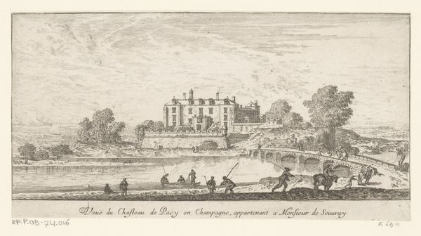 Israel Silvestre created this print of the Palais d'Orléans using etching techniques. The dominant visual experience is one of depth and scale, achieved through careful arrangement of lines, shapes and textures. The eye is drawn from the detailed foreground, with its figures and textured earth, back to the massive yet delicately rendered palace in the distance. Silvestre employs a structural composition, dividing the scene into distinct horizontal bands, each contributing to the overall sense of perspective and grandeur. The dark lines of the foreground contrast with the lighter, more intricate details of the palace, creating a visual hierarchy that emphasizes the building's importance. The use of hatching and cross-hatching adds depth and texture to the print, mimicking the play of light and shadow on the palace's facade. This print is not just a depiction of a building; it's a statement about power, architecture and representation.