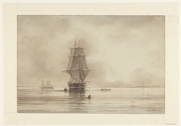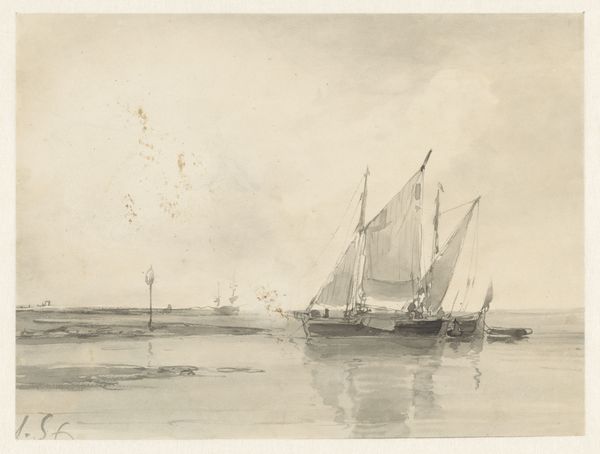 Editor: This is Johan Conrad Greive’s “Tjalk,” made around 1860, using etching and ink. It's a lovely little drawing; the stillness of the water and the way the ship is rendered make it feel almost dreamlike. What draws your eye to this print? Curator: The stillness you mention is key. It speaks to the symbolic power of water in Dutch art – often representing not just livelihood, but also the subconscious, the depths of cultural memory. Notice how the tjalk, a traditional Dutch sailing vessel, sits almost heavy in the water, its image deeply ingrained in the national psyche. Editor: So the tjalk isn't just a boat? It's more of a symbol? Curator: Precisely. Think of the maritime paintings of the Golden Age; ships represent prosperity, exploration, but also vulnerability against the vastness of nature. Greive, even in this smaller, later work, taps into that deep well of symbolism. The ship becomes a vessel for collective experience. Consider too, how the etching technique itself, with its delicate lines, mirrors the fragility of human endeavor against the relentless sea. Editor: It makes me wonder if this relates to a Dutch identity. I can imagine how deeply connected they are with maritime themes. Curator: Absolutely. The imagery connects them to their history, their trade, their relationship to the sea, and the continuous effort required to maintain their land. Does that cultural memory of national identity also resonate when considering what Tjalk represents to you? Editor: That's a powerful perspective. Now when I look at this piece, I don't just see a boat, but something more profound about a people's history and their connection to their environment. Curator: And that connection, that interplay of identity and environment, is what continues to give these images their lasting impact.