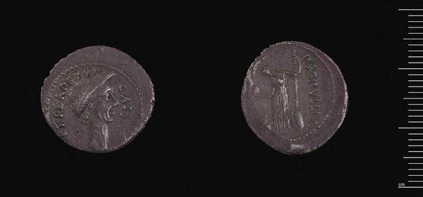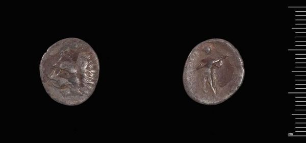 Editor: Here we have a coin, a Triobol of the Aenianes of Thessaly. The Aenianes were the artists. It looks ancient, and a little worn, but I can make out figures on both sides. What stands out to you? Curator: Look at how the imagery on this small coin speaks volumes. On one side, we see a human figure. The act of throwing, a universal gesture. Does it remind you of any other mythic figures or gods from that period? Editor: Maybe an archer, like Apollo? Curator: Precisely. The other side shows a helmeted head, a symbol of power or protection. What do these symbols, together, tell us about the values of the Aenianes? Editor: Perhaps they valued strength and skill, both physical and strategic. It's amazing how much they could convey on such a tiny object. Curator: Indeed, symbols act as cultural shorthand, preserving meaning across time. It makes you wonder what messages we embed in our currency today.