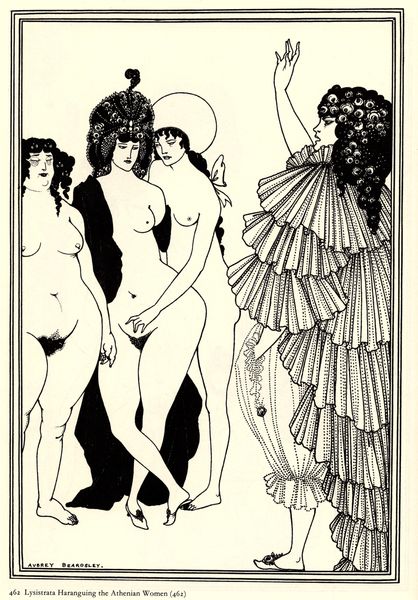 Editor: This is Aubrey Beardsley's "The Mysterious Rose Garden" from 1895, rendered in pen and ink. It has a strange, dreamlike quality. What are your initial thoughts when you look at it? Curator: For me, this drawing speaks volumes about the anxieties surrounding labor and artistry in the late 19th century. Notice Beardsley’s meticulous ink work – each stroke represents a deliberate act of production. Yet, he's depicting a decadent scene. The question is, does this intense labour justify such frivolous subject matter? Editor: Frivolous? I see it as more symbolic, especially with the contrast between the nude figure and the draped one. Curator: Ah, but that contrast is key! Consider the socio-economic context. Mass production was challenging traditional craft. Beardsley's style, highly detailed and reproducible, engaged with this tension. Are these figures representations of some mythical ideal or just consumer objects made for consumption and display? Editor: So, the very act of creating the drawing comments on the commercial art world of the time? The tools influence the concept. Curator: Precisely! The materials themselves – pen, ink, paper – are relatively inexpensive, making art accessible. He then fills these mass produced items, and comments about social ideals. How does that make you feel about the piece? Editor: It certainly makes me rethink my initial interpretation. I was so focused on the imagery, I missed how Beardsley's process contributes to the overall meaning. Thank you! Curator: Likewise, your perspective reminded me of the symbolic weight we often forget in a Materialist approach. It's about blending an awareness of how, who, when, where with what meaning this brings to contemporary art.