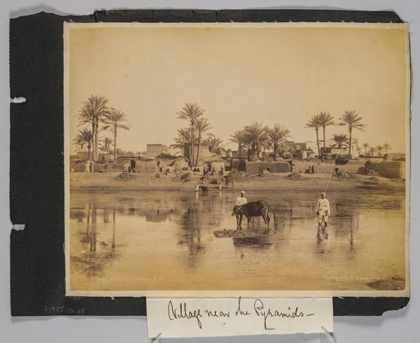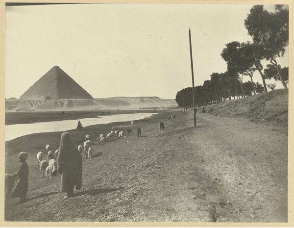 This photograph, "Resting Caravan by the Bank of the Nile," presents a sepia-toned scene of daily life juxtaposed with the grandeur of ancient monuments. The composition is structured by the horizontal line of the riverbank, dividing the image into earth and sky. Note how the anonymous photographer uses the pyramids as a backdrop, dwarfing the human and animal figures in the foreground. The light, filtered and soft, unifies the scene, yet the pyramids retain a stark, geometric presence. They become signs, not just of history, but of an immutable, monumental power. Consider how the photograph plays with scale. The pyramids, symbols of enduring strength, contrast with the transient nature of the resting caravan. This juxtaposition invites us to ponder themes of time, permanence, and the human condition against the backdrop of civilization.